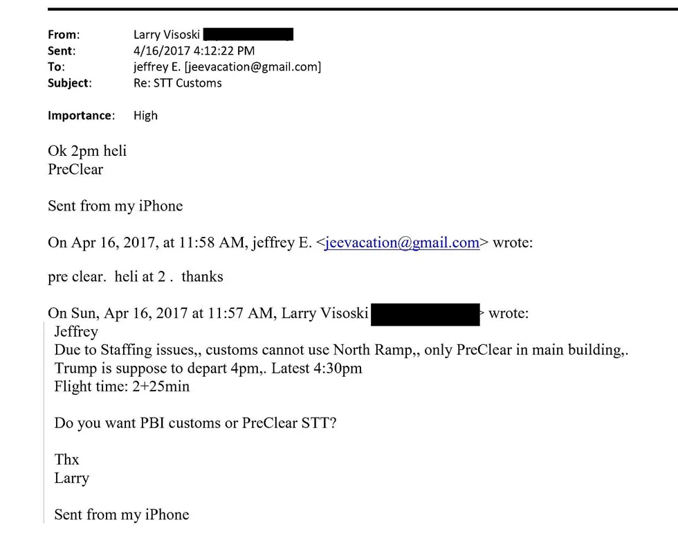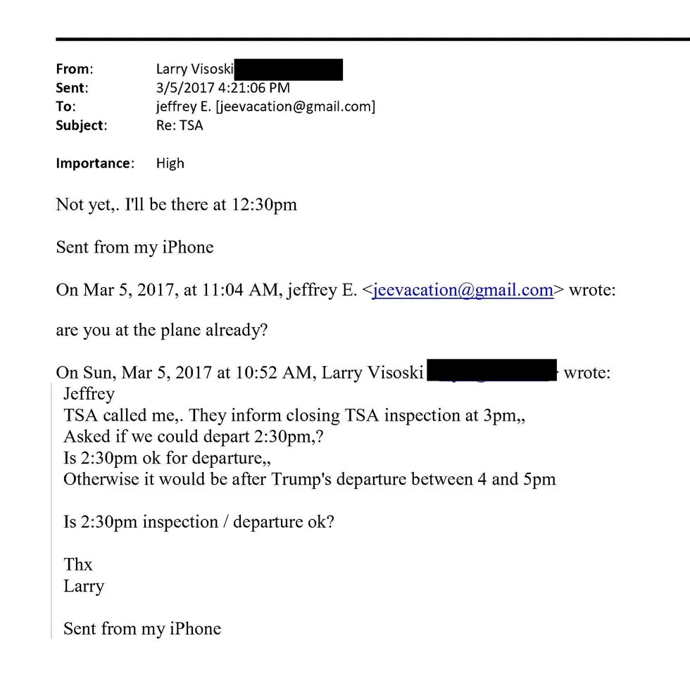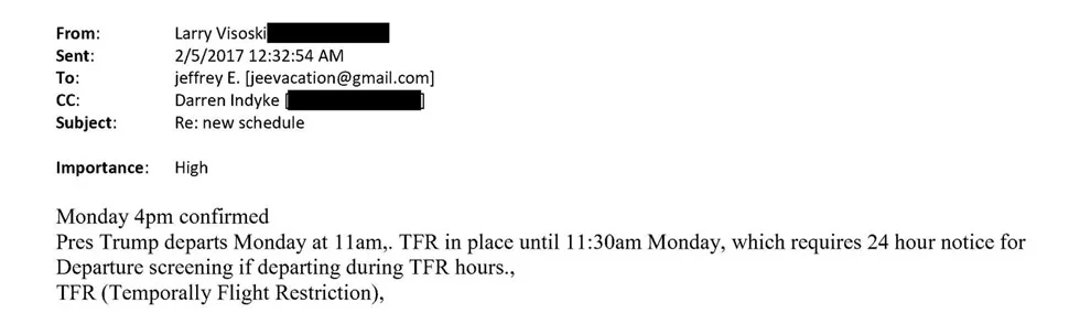 “Jeffrey, the TSA called. They told me they’re closing security at 3 p.m. and asked if we could leave at 2:30 p.m. Is 2:30 p.m. okay for us?” he wrote. “If not, it would be after Trump leaves, between 4 and 5 p.m.”