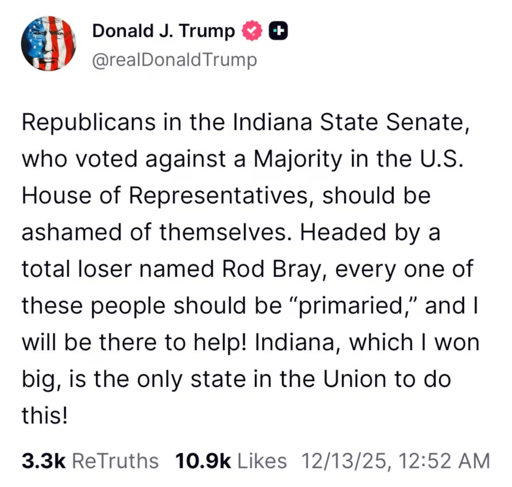 In November, Indiana Senate President Roderick Bray said the proposal lacked the votes to pass the Senate and insisted he would not call a December session to vote on the measure. After Trump publicly attacked Bray on Truth Social and House Speaker Mike Johnson intervened, Bray reversed course and agreed to bring the matter to a vote.