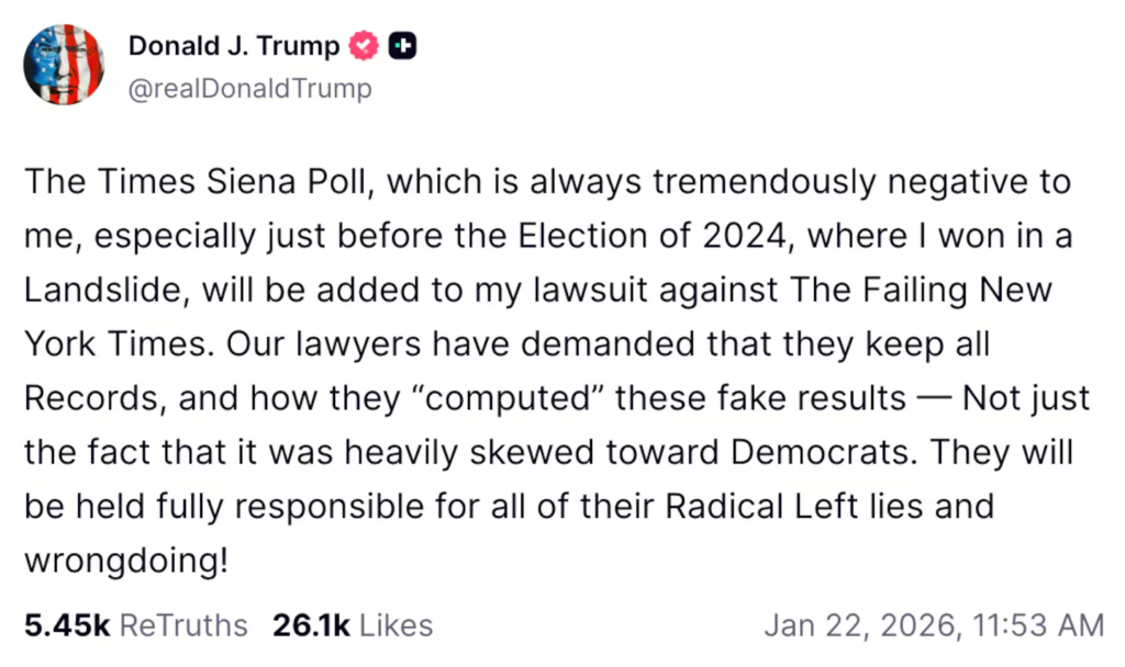 Among the topics covered in this barrage of Posts were a video of White House Deputy Chief of Staff Stephen Miller attacking Trump’s opponents, a court victory authorizing Immigration and Customs Enforcement (ICE) to use force against protesters in Minnesota, conspiracy theories about alleged fraud in the 2020 election, threats of legal action against The New York Times for publishing polls he disliked, and a vicious attack on Special Counsel Jack Smith.