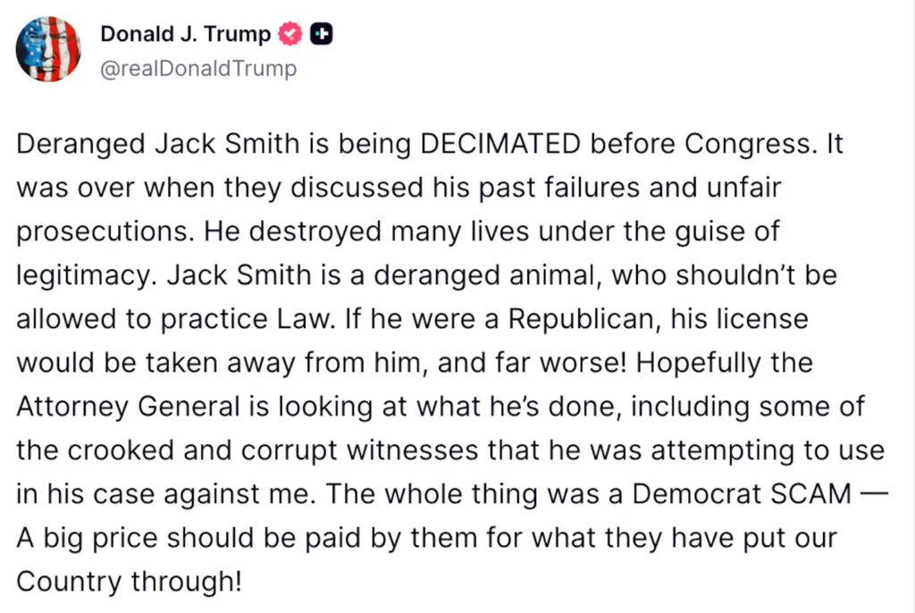 Smith was testifying publicly before Congress about his lawsuit against Donald Trump for allegedly attempting to overturn the 2020 election results when the president tweeted: “Jack Smith is a psychopath and should not be allowed to practice law.”