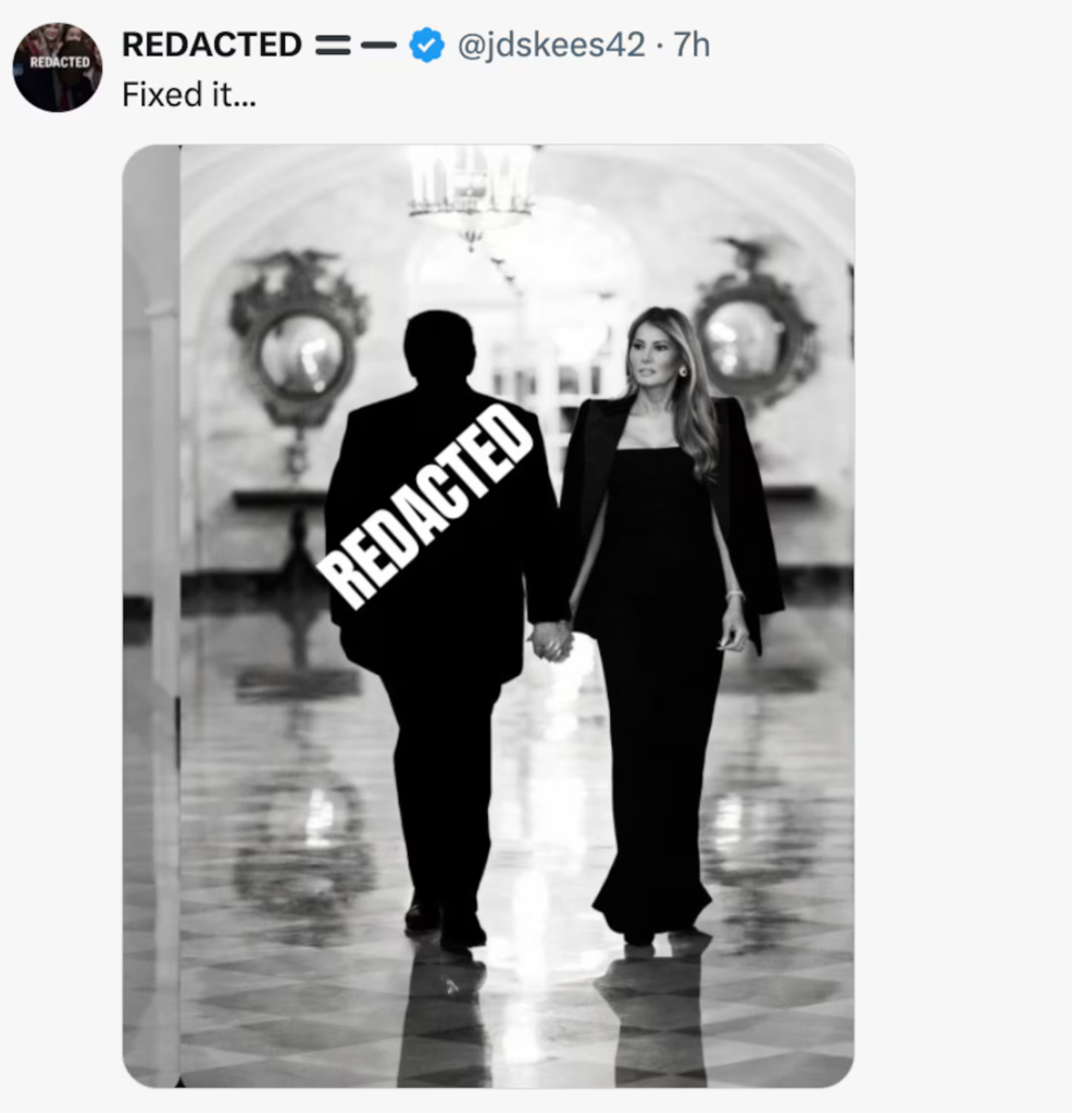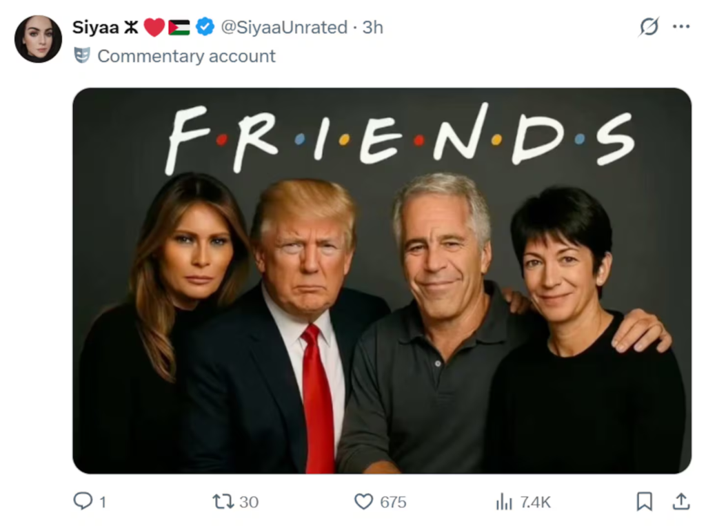 Another internet user put the First Lady back at the center of the controversy, altering her image to show her alongside Trump, Epstein, and Ghislaine Maxwell in a parody of the “Friends” characters, using the show’s iconic font.