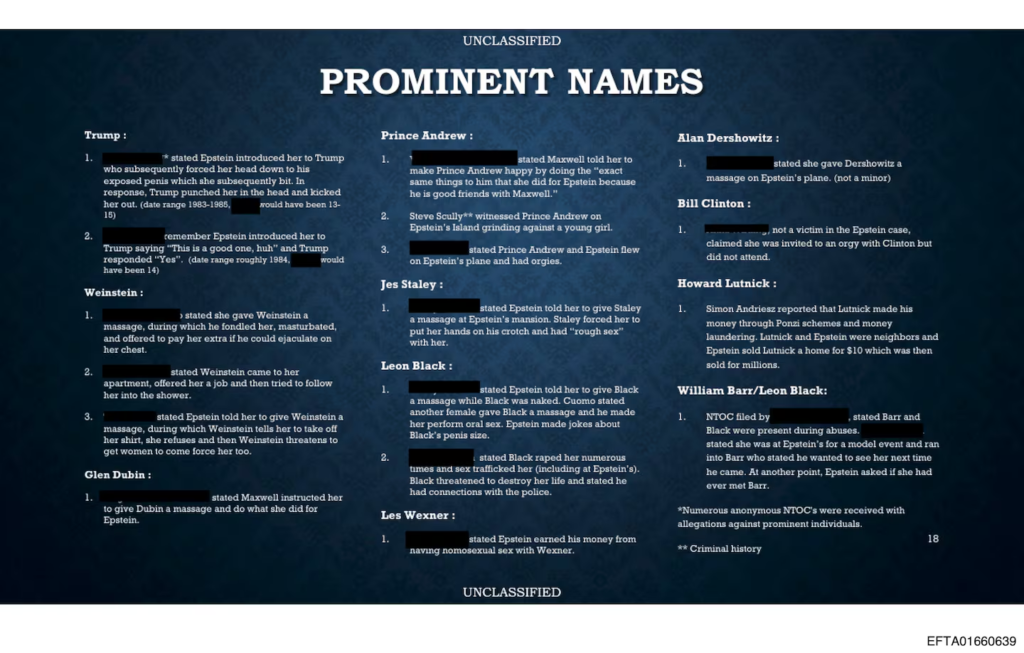 Trump’s accuser claims he forced her to lower her head and coerced her into performing oral sex on him after Epstein presented them. This allegation appears in an internal FBI presentation, among the Epstein documents released by the Justice Department.