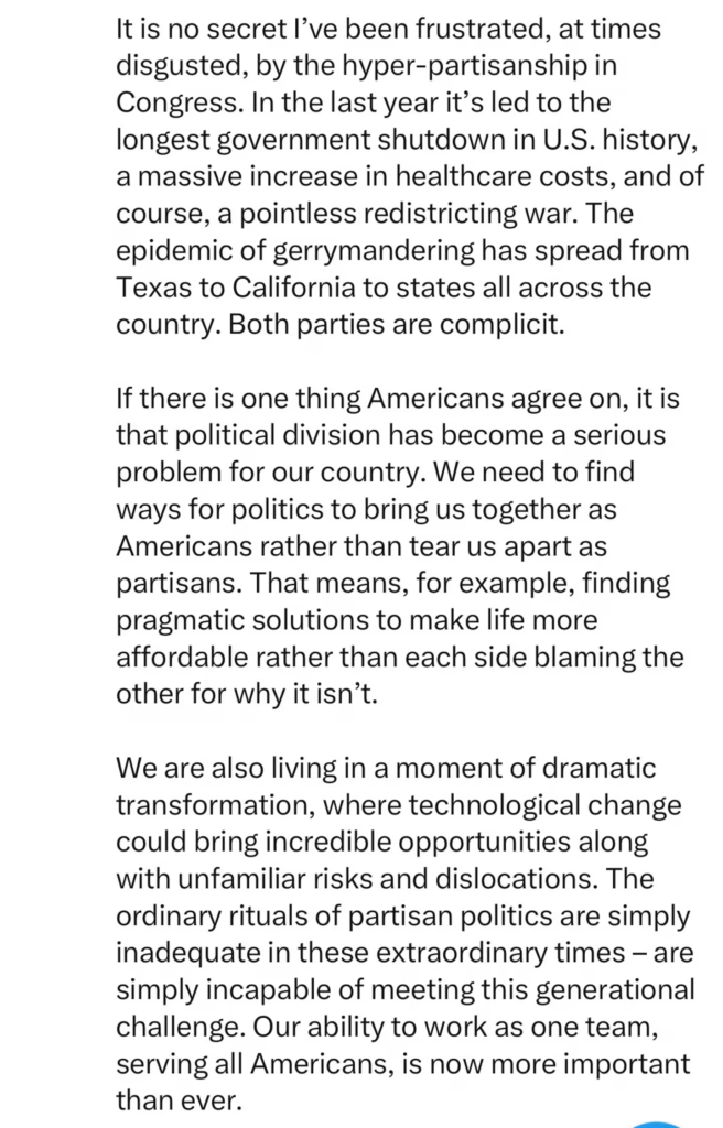 He continued: “I make no secret of my frustration, even disgust, with the excessive partisanship in Congress. Last year, it resulted in the longest government shutdown in U.S. history, a massive increase in healthcare costs, and, of course, the absurd gerrymandering war.” This gerrymandering epidemic has spread from Texas to California, and to other states across the country. And both parties are complicit.