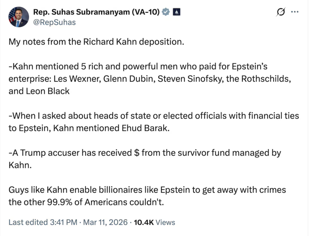 “People like Khan allow billionaires like Epstein to escape justice for crimes that 99.9% of Americans could not commit,” Subramaniam wrote in his post.