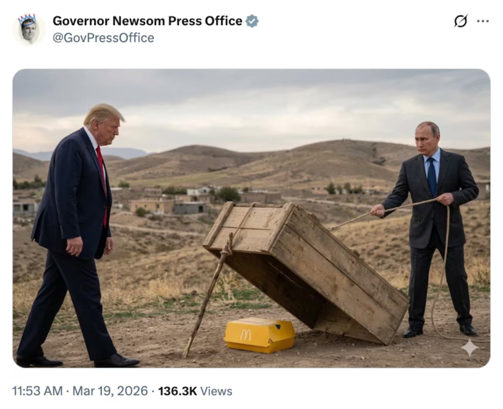 On Thursday, Mr. Newsom posted an AI-generated image suggesting that Putin is setting a trap for Trump, accompanying it with a sarcastic caption alluding to the President’s well-known fondness for McDonald’s meals.