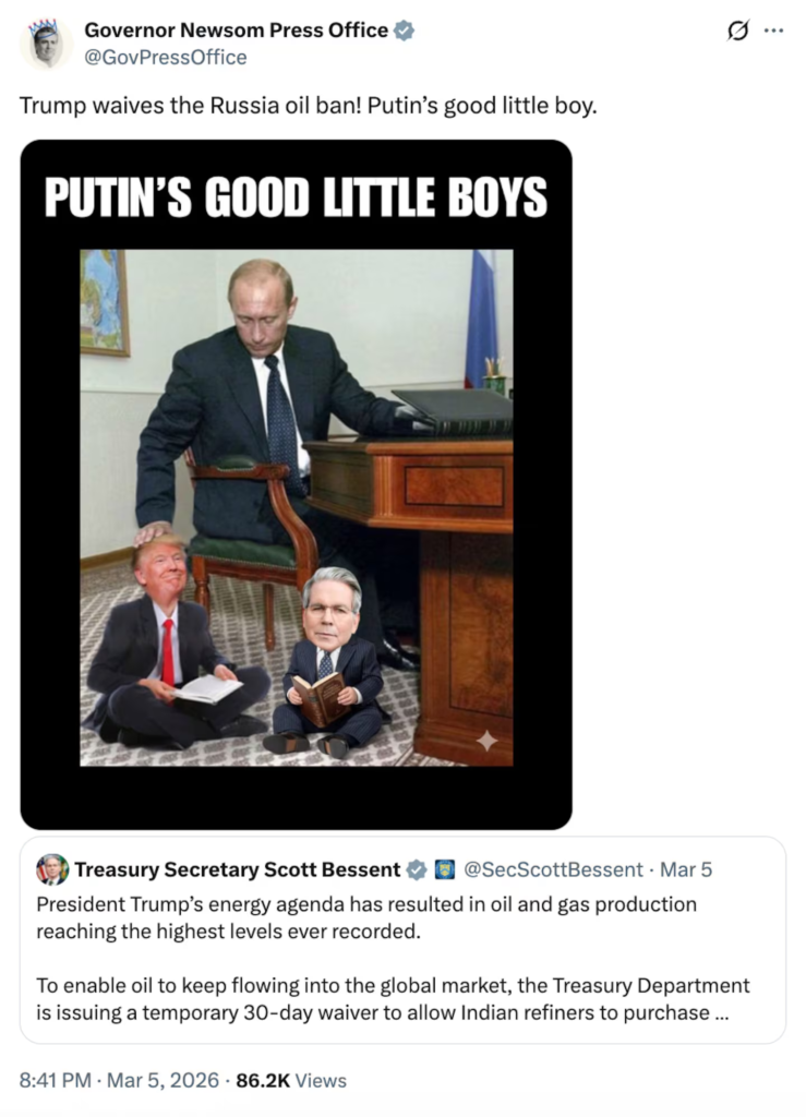Mr. Newsom, 58, reacted to this news by branding Trump and Treasury Secretary Scott Bessent as Putin’s “obedient little boys”—speaking out, once again, through the medium of an AI-generated image.