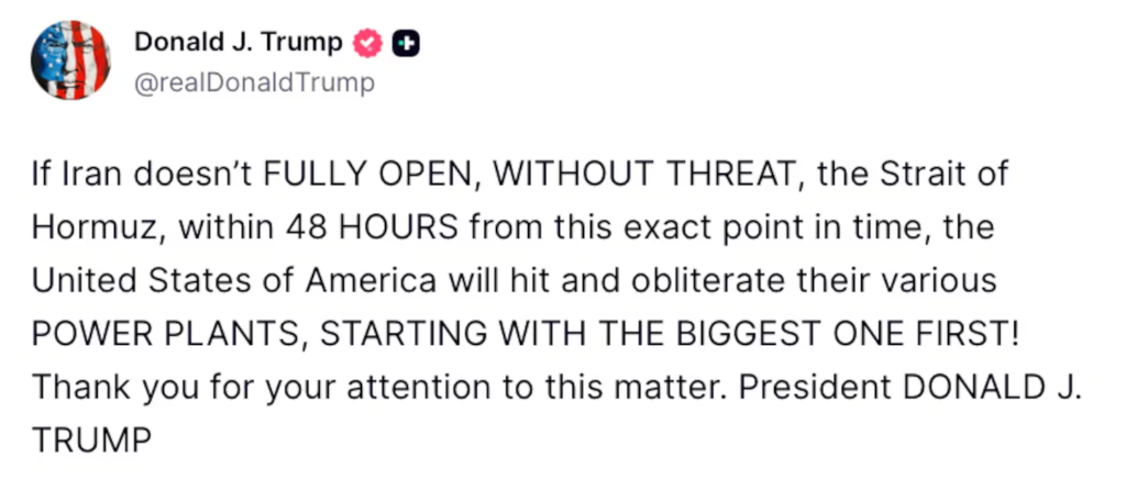 In his second post—written in a distinctly aggressive tone—Trump wrote: “If Iran doesn’t FULLY OPEN, WITHOUT THREAT, the Strait of Hormuz, within 48 HOURS… the United States… will hit and obliterate their various POWER PLANTS,”