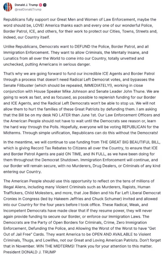 He wrote: “In the meantime, we will continue to use funds from the ‘THE GREAT BIG BEAUTIFUL BILL’—which grants citizens across the country record tax refunds—to ensure that Immigration and Customs Enforcement (ICE) and Border Patrol agents receive their pay on time and in full, just as we did unfailingly for them throughout the government ‘shutdown’ caused by the Democrats.”